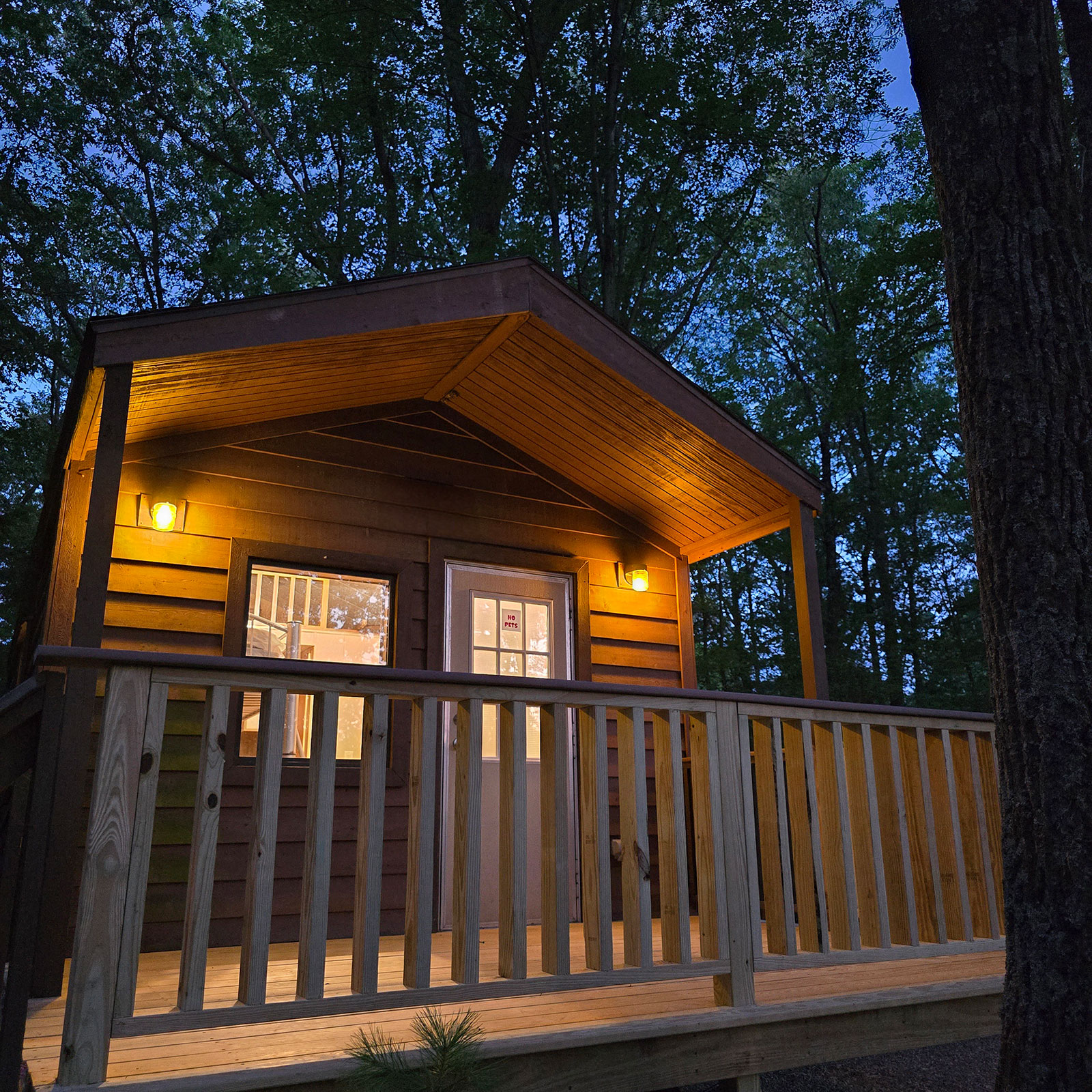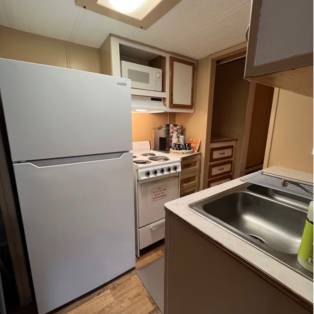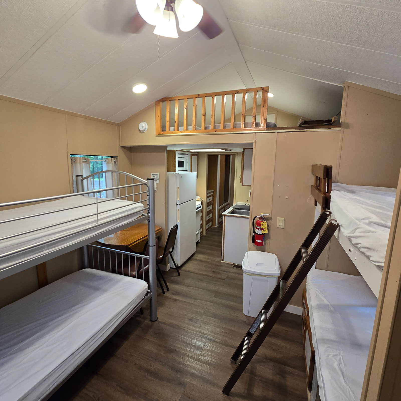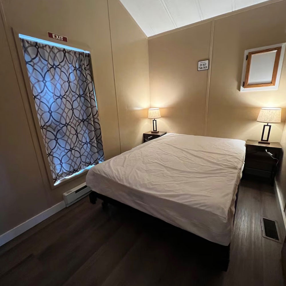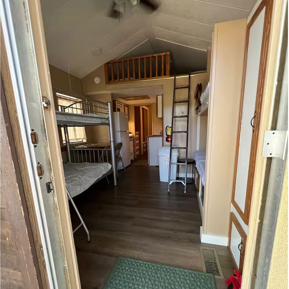 Enjoy modern conveniences including 4 bunks, loft with 2 mattresses, and a full size bed. Our cabins also include heat & A/C, private bath with shower, stove, oven, microwave, coffee maker, refrigerator, toaster, plates & silverware.