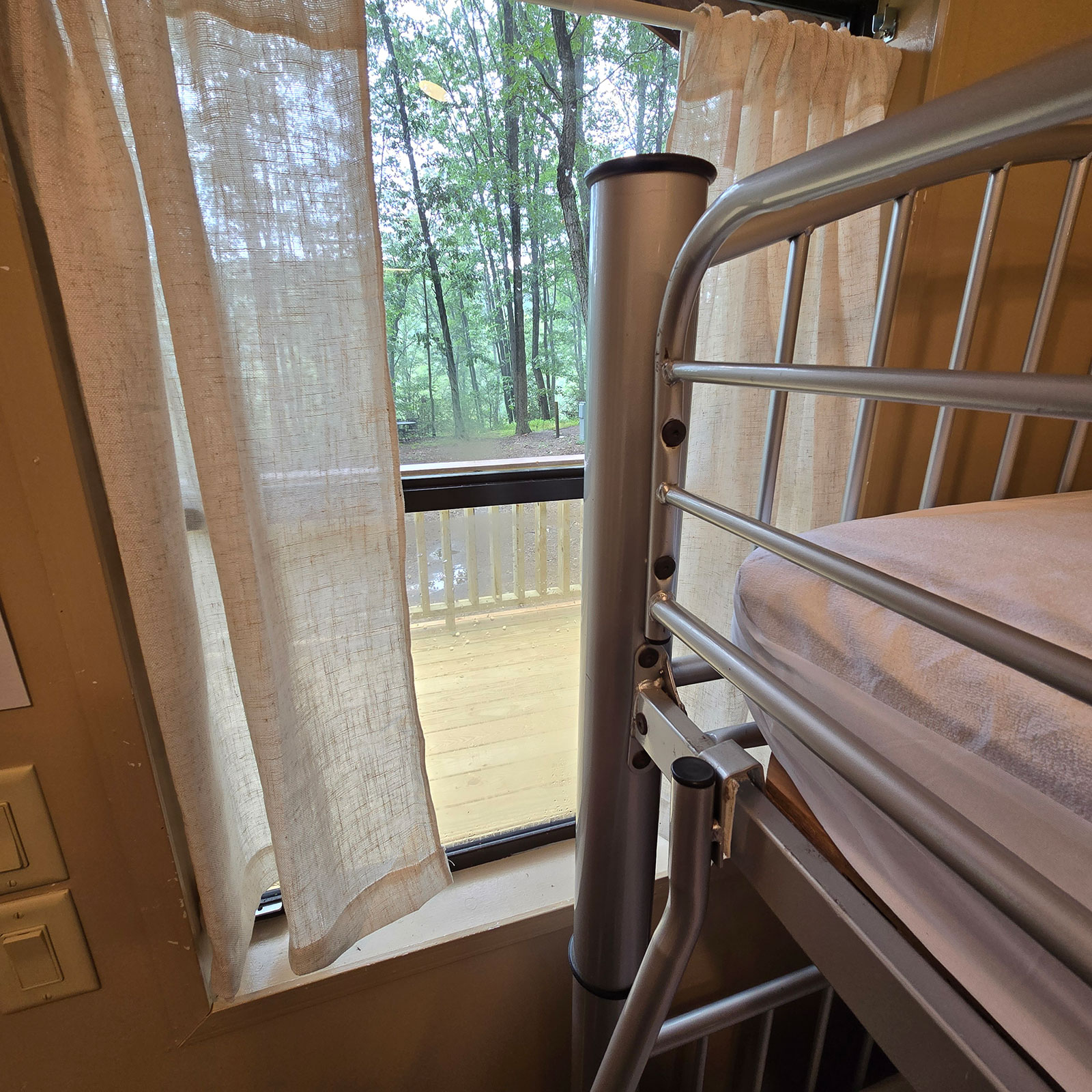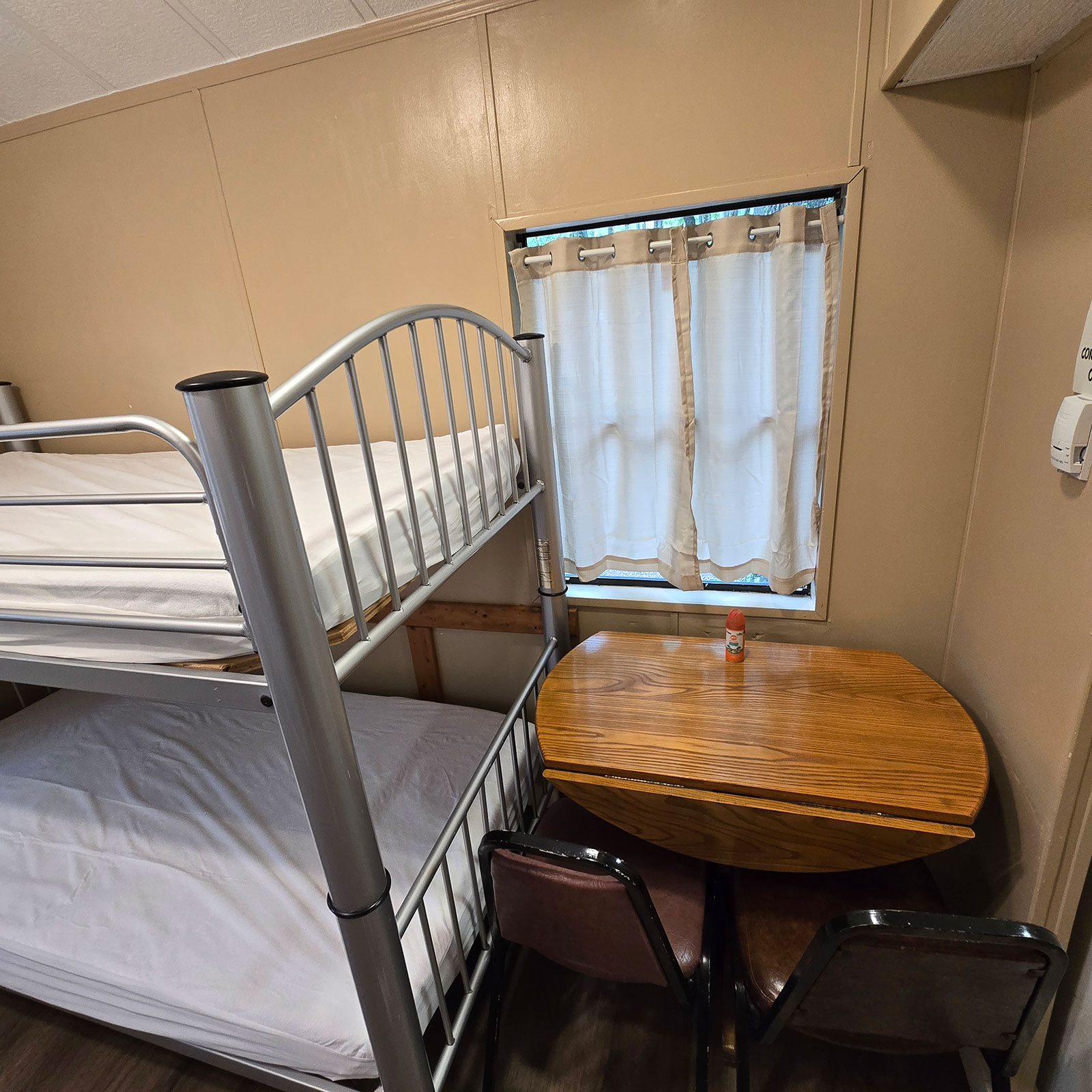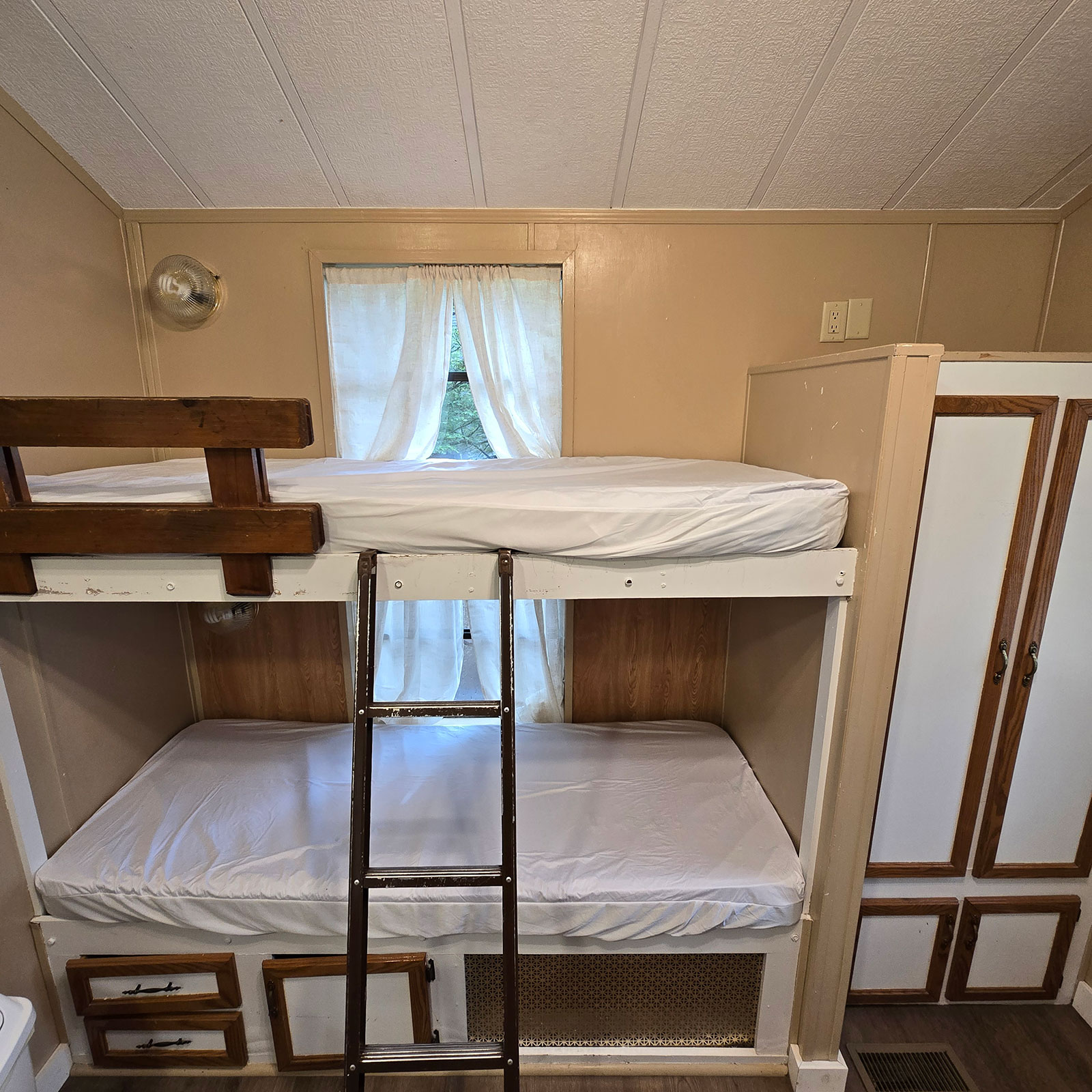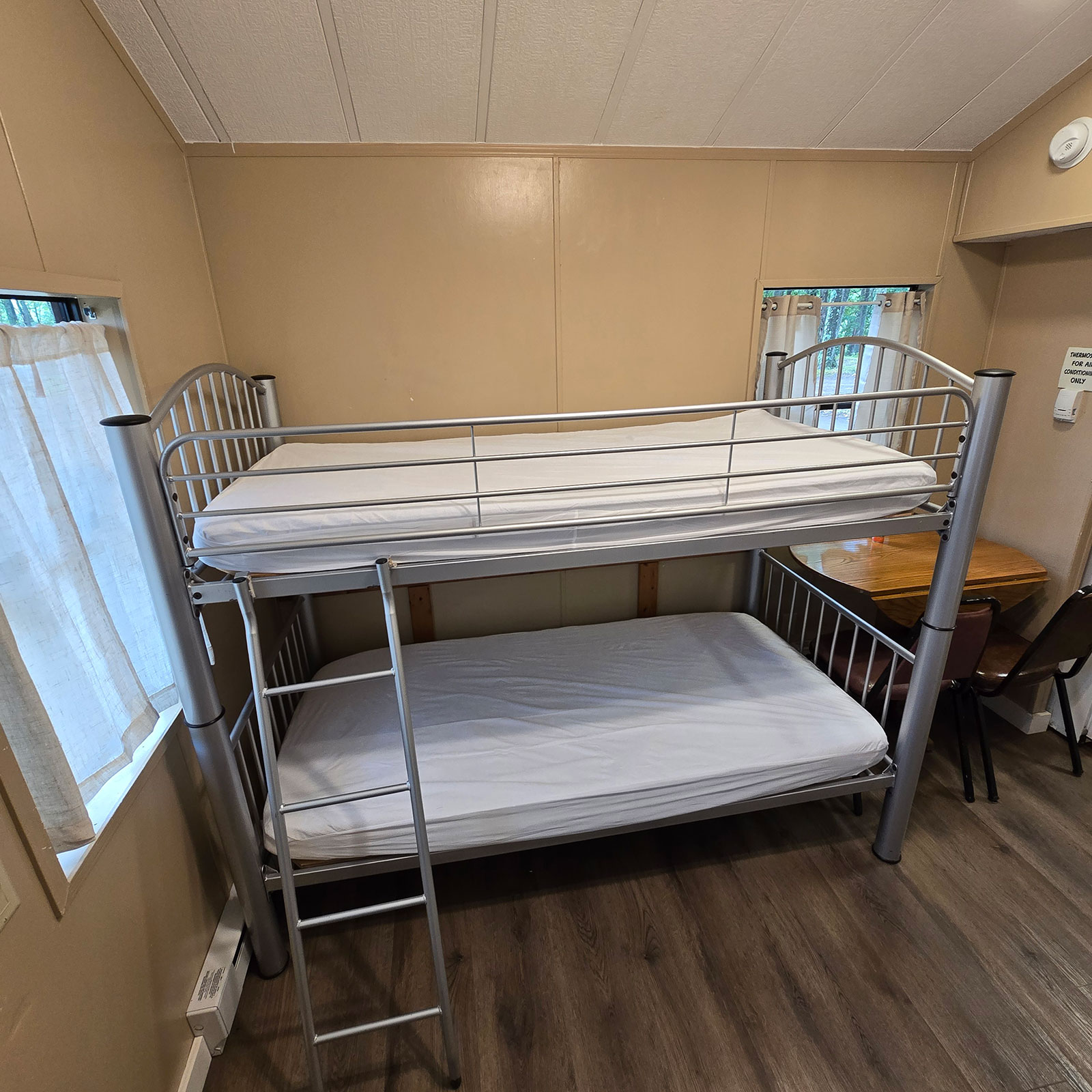 Enjoy modern conveniences including 4 bunks, loft with 2 mattresses, and a full size bed. Our cabins also include heat & A/C, private bath with shower, stove, oven, microwave, coffee maker, refrigerator, toaster, plates & silverware.